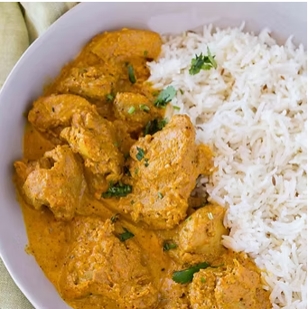A creamy, mildly spiced chicken curry paired with fragrant ghee rice.